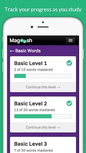 Jede Ebene Sie schlagen entriegelt eine härtere: mehr Wörter und erweiterte Wortschatz. Wörter, die Sie nicht wissen, wird wiederholt, bis Sie sie beherrschen, Abstand Wiederholung verwendet, die gezeigt wurde, eine sehr effektive Auswendig Strategie.